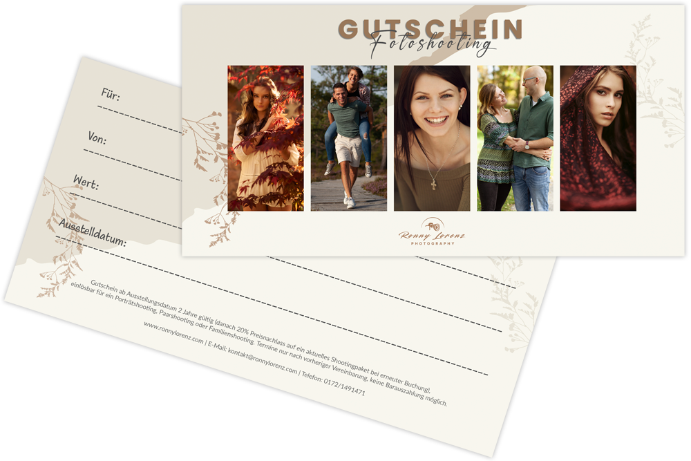 Bezahlung über PayPal an mail@ronnylorenz.com (Option Freunde senden) oder per Überweisung. Nach Zahlungseingang sende ich dir den Gutschein versandkostenfrei per Post zu oder du holst ihn dir persönlich bei mir ab. Gutschein ab Ausstellungsdatum 2 Jahre gültig, danach 20% Preisnachlass auf ein aktuelles Shootingpaket bei erneuter Buchung. Keine Barauszahlung möglich.